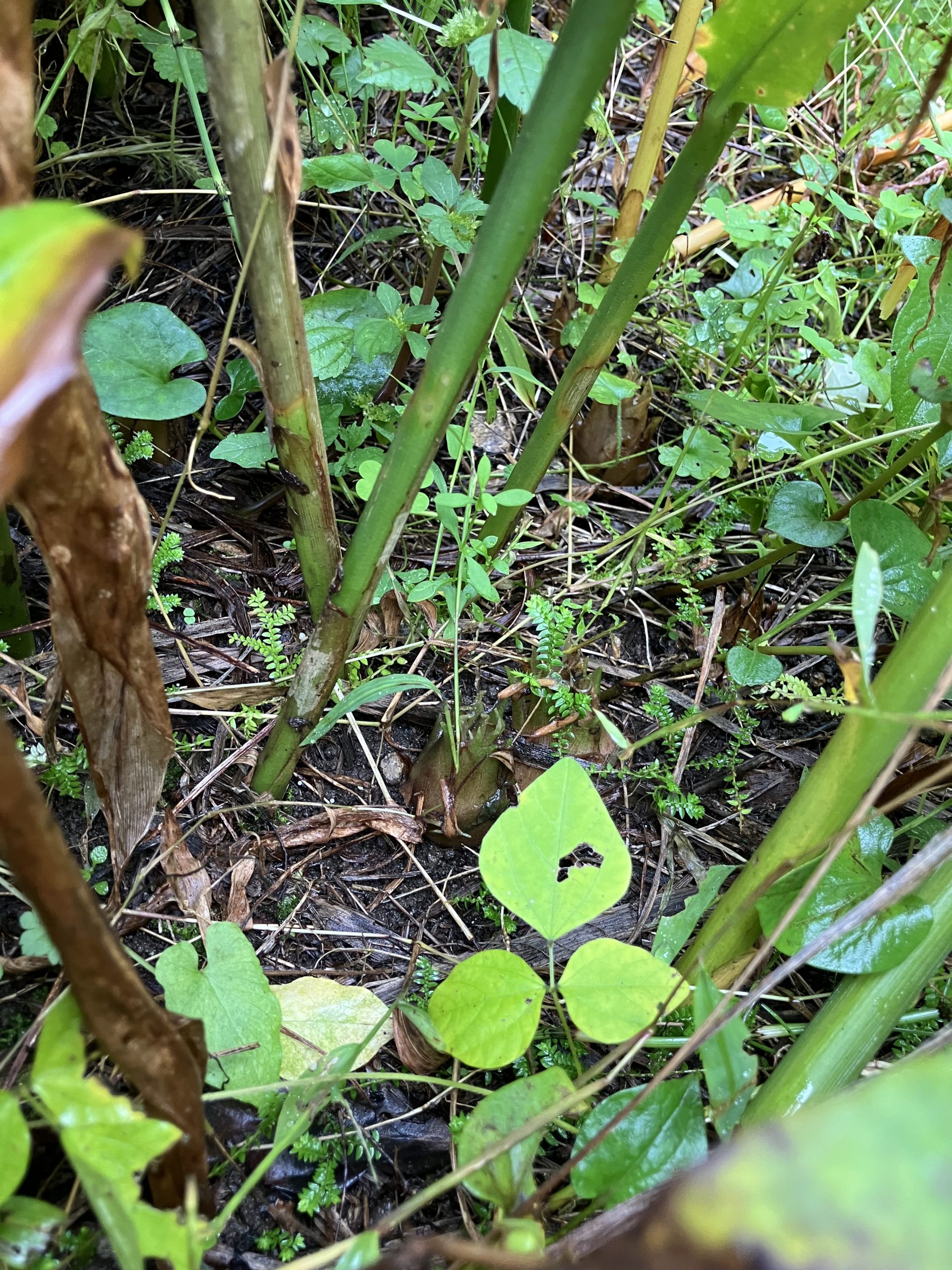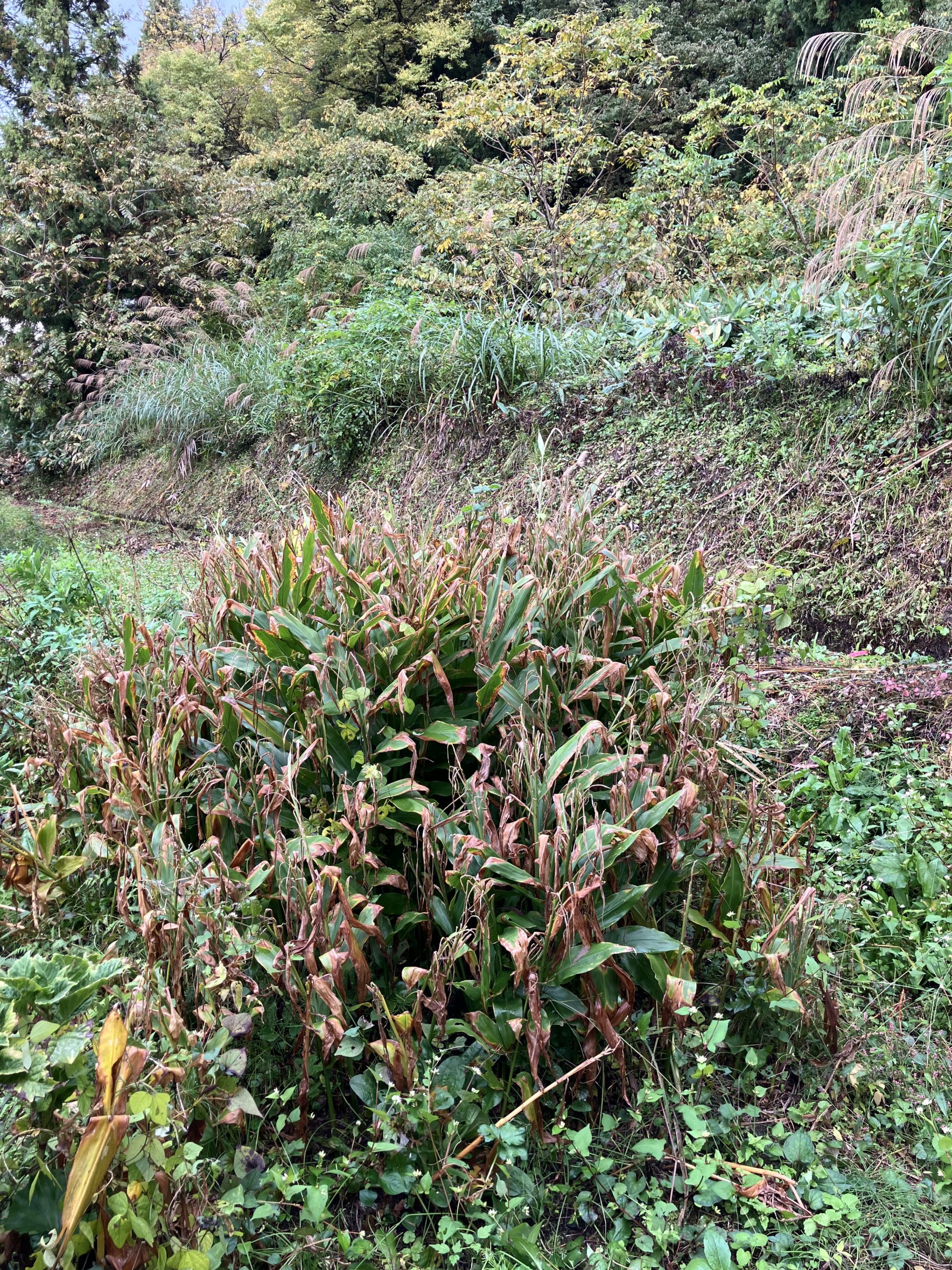 家の裏がすぐに山です。 うっそうとしすぎてどれがミョウガか分かりませんね。
