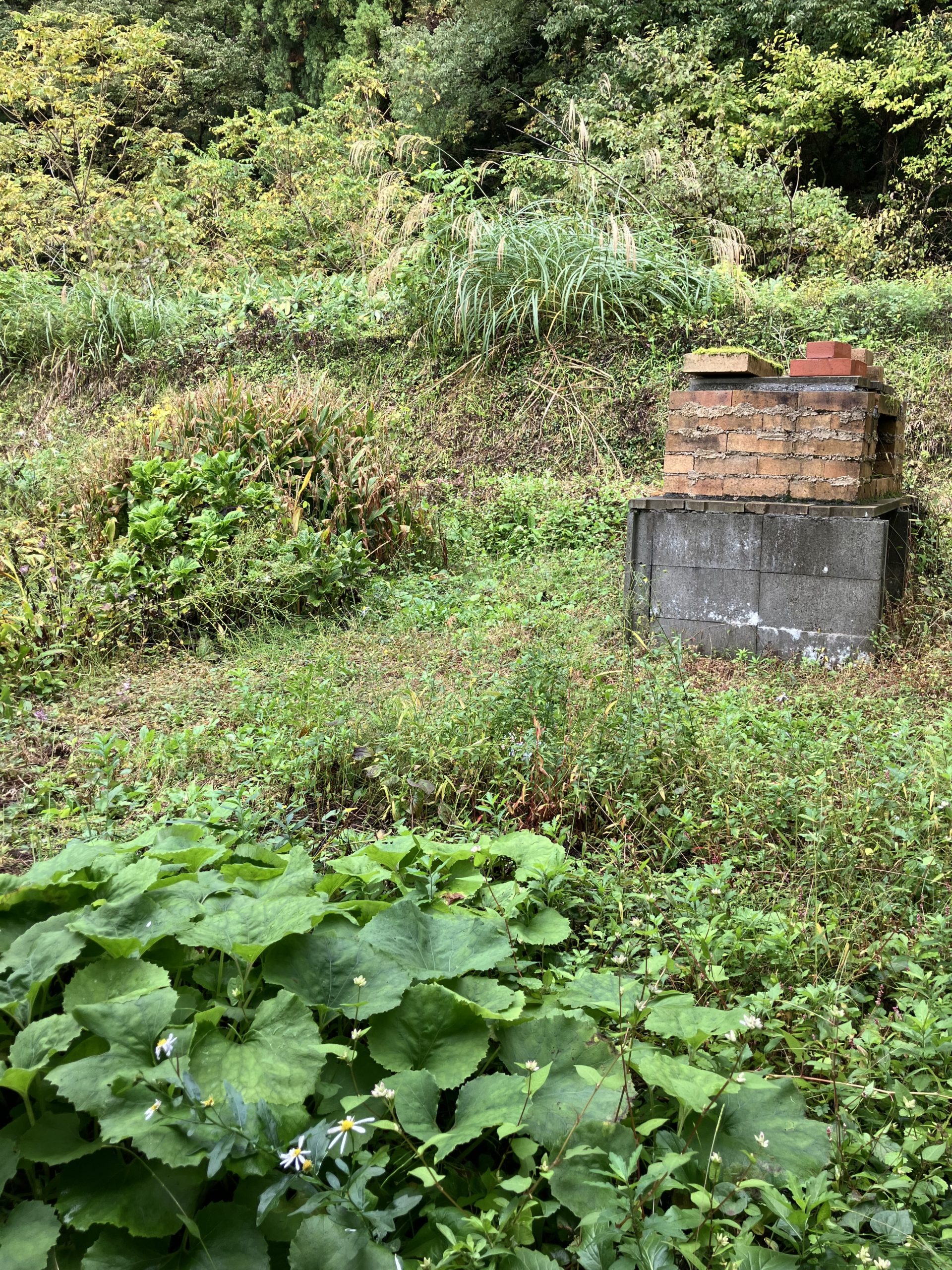 一番手前にある大きめの葉はフキノトウのフキ。敷地内に勝手に生えてます。毎年、春に頂いてます。